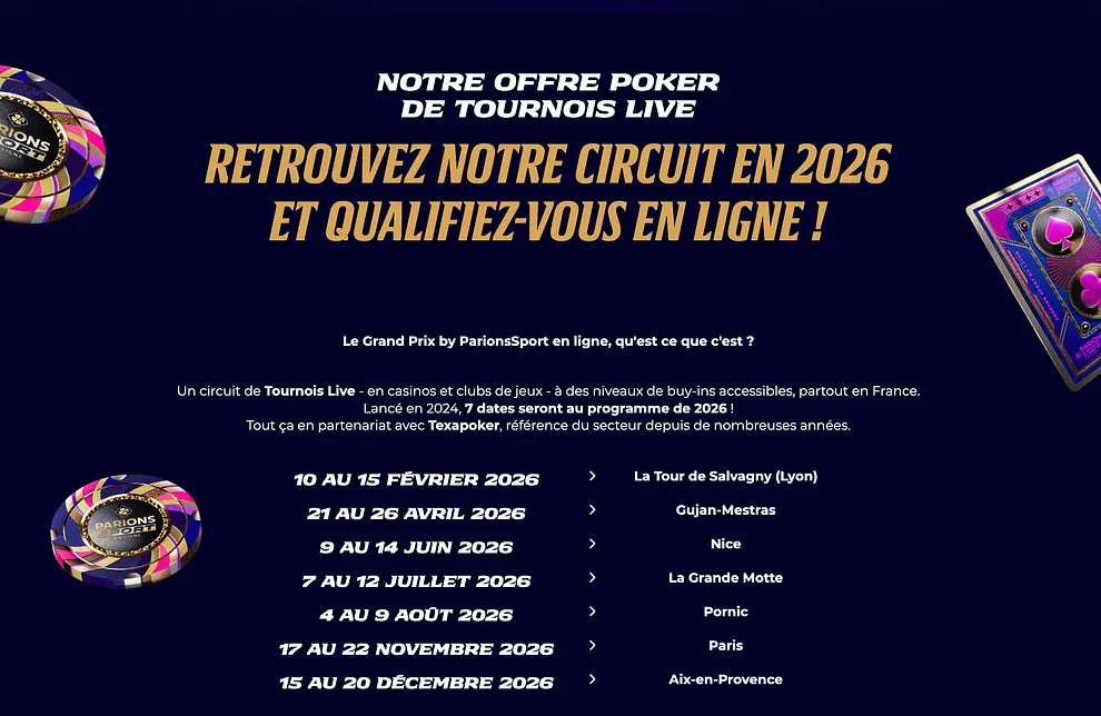 Le Grand Prix by Parions Sport est le nouveau circuit live de la FDJ, organisé en partenariat avec Texapoker. Après une première expérience réussie en 2024, le Grand Prix est revenu en 2025 et 2026 avec un calendrier élargi proposant sept étapes dans des lieux emblématiques comme Saint-Amand-les-Eaux, Paris, La Grande-Motte ou Aix-en-Provence. Ce festival live propose cinq tournois majeurs accessibles à tous les niveaux de buy-ins, du Peloton à 150 € jusqu’au prestigieux Master à 600 €.