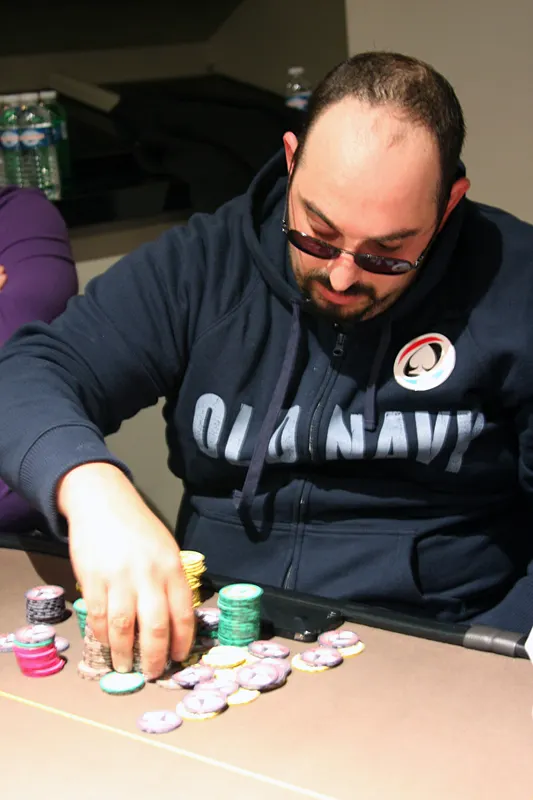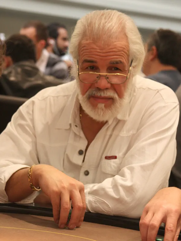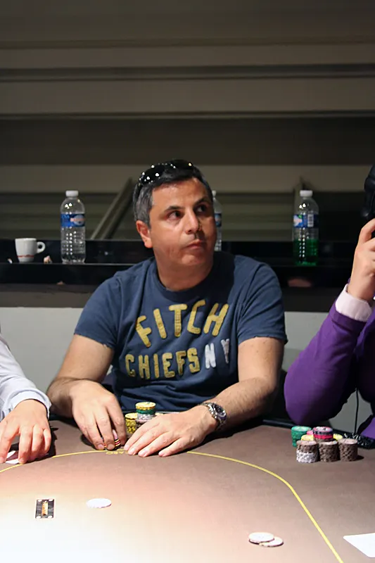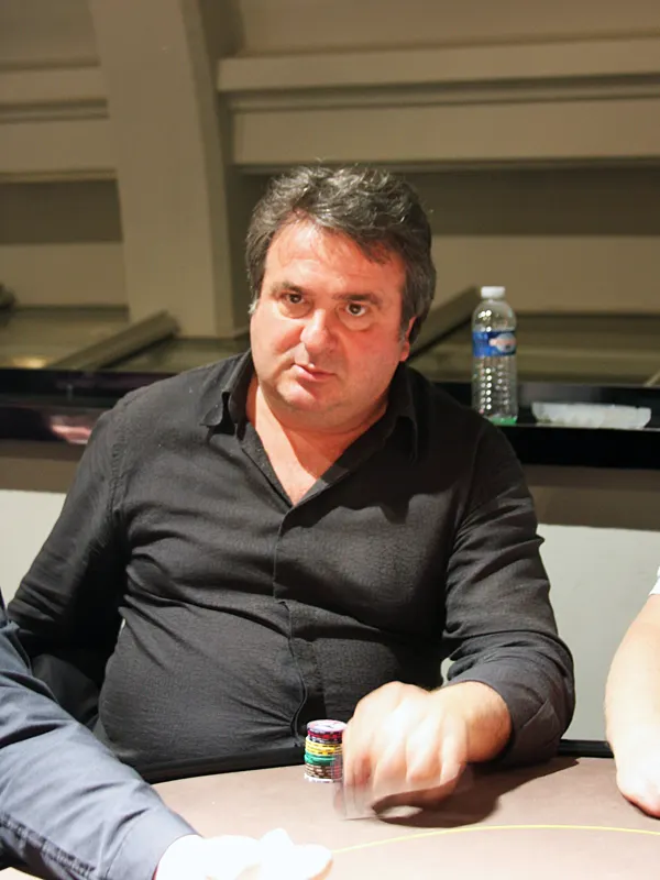 Alors que la dernière main de la journée doit être jouée, Jean Pierre Petroli en profite pour relancer à 8.000 en position intermédiaire. Seul le joueur en big blind décide de poursuivre le coup et paye les 8.000 demandé.